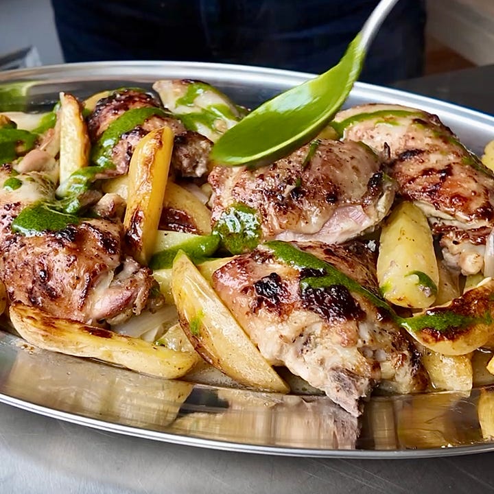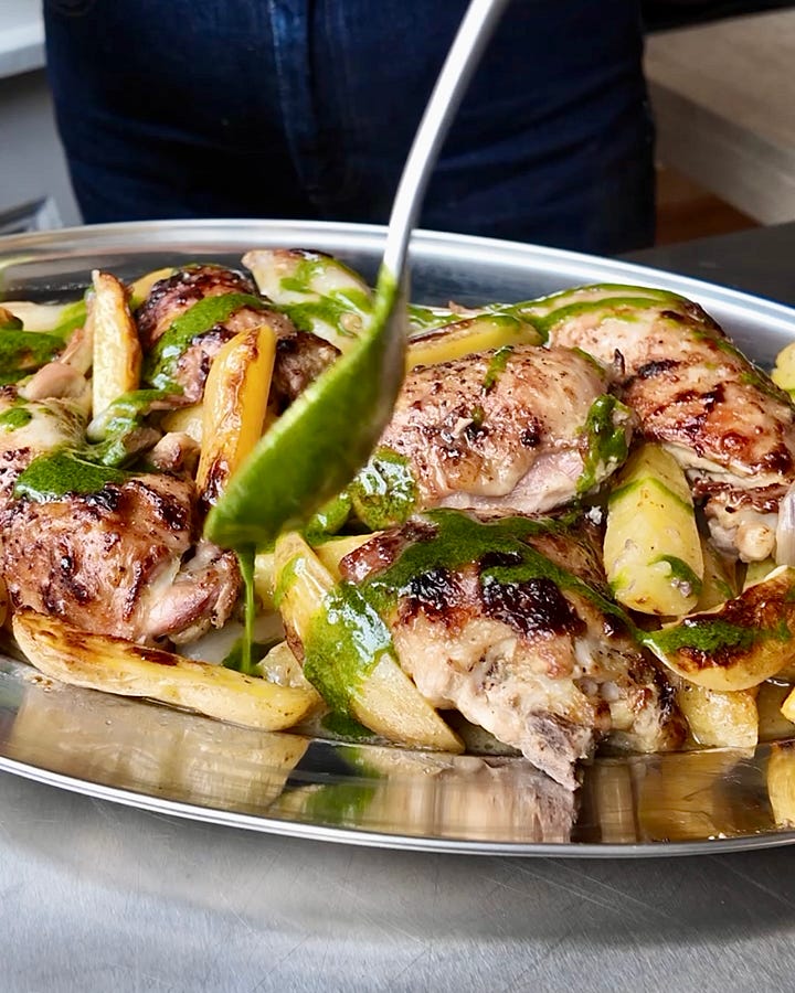 Serve. Plate everything up onto a large platter, making sure to scrape up every last drop of the incredible gravy from the tray and pour it all over. Drizzle the green sauce over the chicken and potatoes and serve immediately.