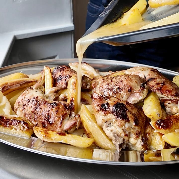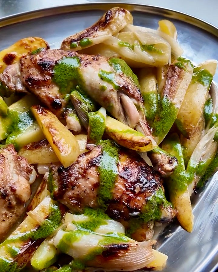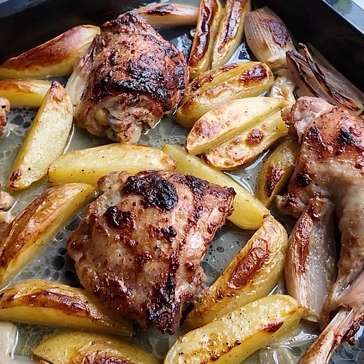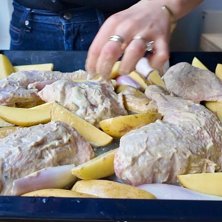 Something truly magical happens in the oven tray with this dish. The alchemy starts when the anchovy marinade, a strong, salty, savoury blitz of anchovies, garlic, Dijon, and a lotta lemon, totally melts under the heat. It combines with the rendering chicken fat and begins to caramelise on the pan.